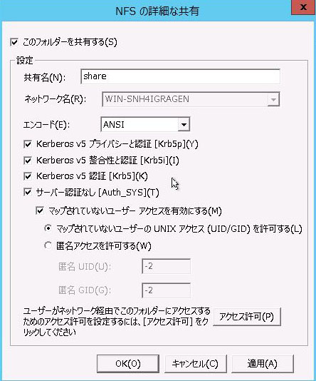 続いてNFS共有を行います。ここでは特に制限を設けずに読み書き共有用フォルダを作成します。