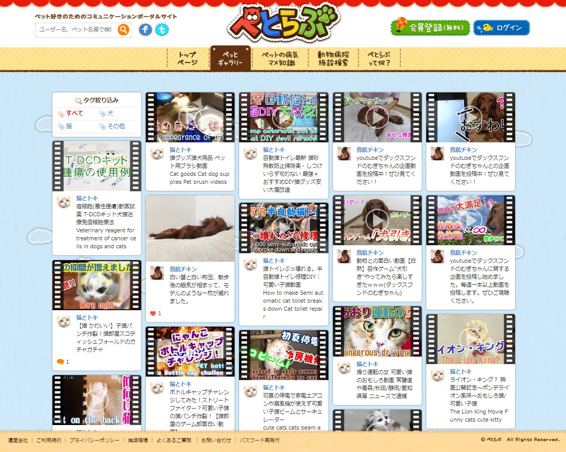 ペット飼い主様向けSNS・ポータルサイトを構築致しました。 Facebook・twitterとの連携、EC機能、ペット関連店舗の検索機能や情報コンテンツなど、総合サイトとしての機能をもつサービスの企画/構築/運営を手掛けております。