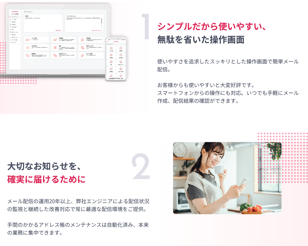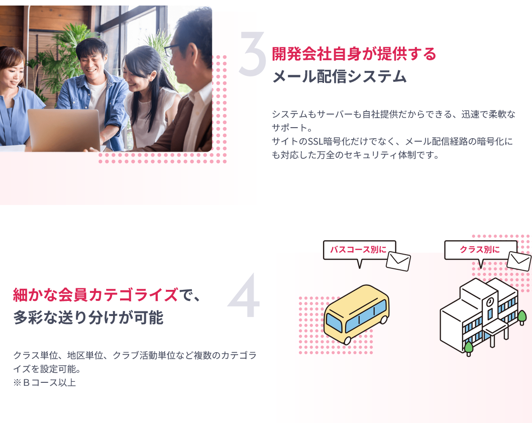 幼稚園・学校・PTA向けの携帯メール配信システムです。一括で多くの人に簡単にメールを送ることができます。メール送信予約や開封確認メールなど、機能も充実しています。