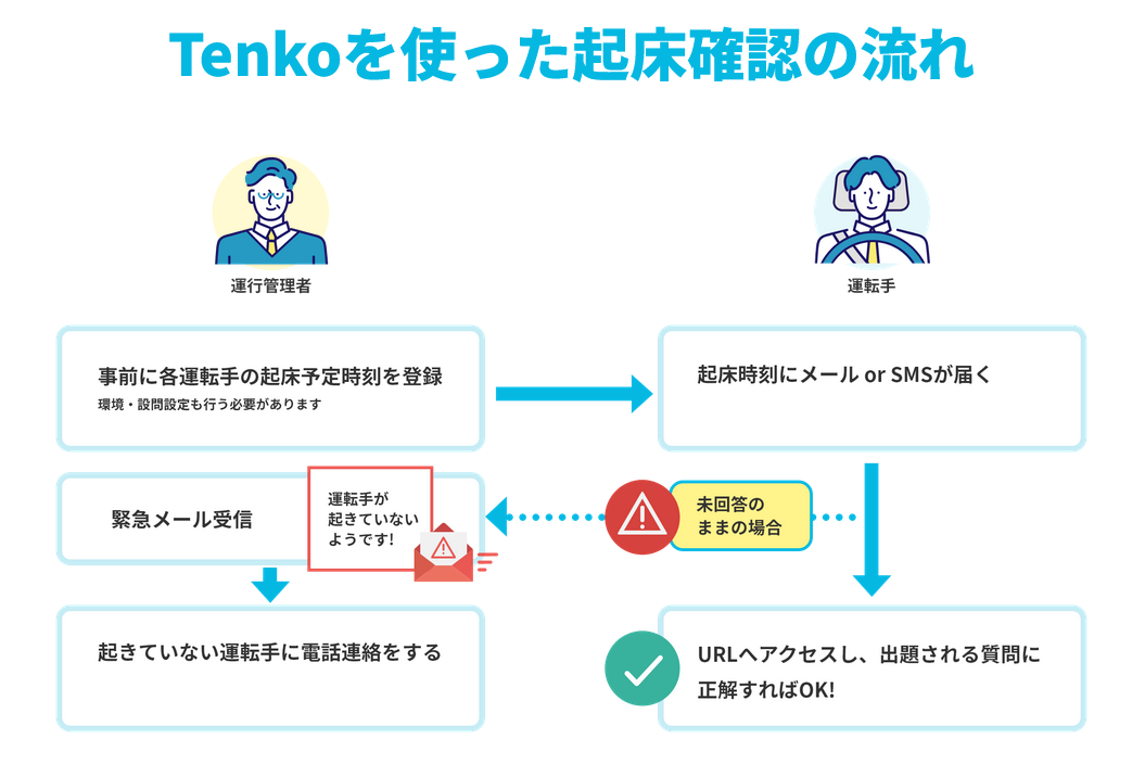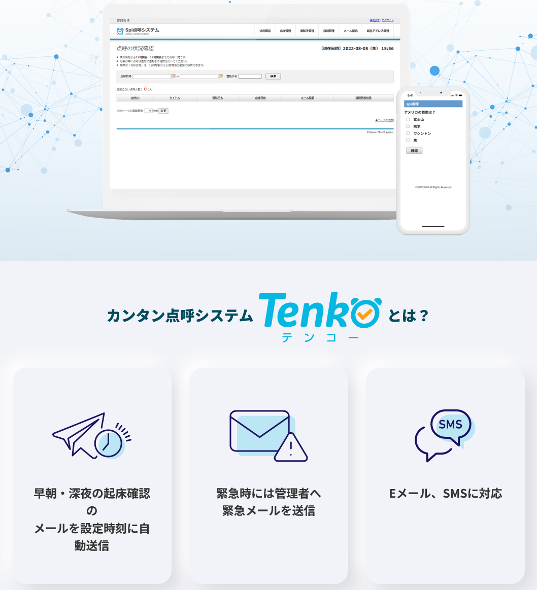スタッフの応答を確認するためのシステムです。 モーニングコールや工程確認などに利用されています。点呼時間になるとメール、SMSまたは自動音声にて点呼を送信、応答がなければ管理者へ連絡される様になっています。 早朝・深夜など管理担当者の対応が困難な場面でスタッフの確認を行う際に特にお勧めです。